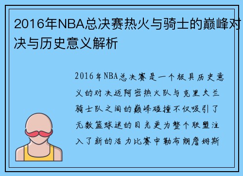 2016年NBA总决赛热火与骑士的巅峰对决与历史意义解析